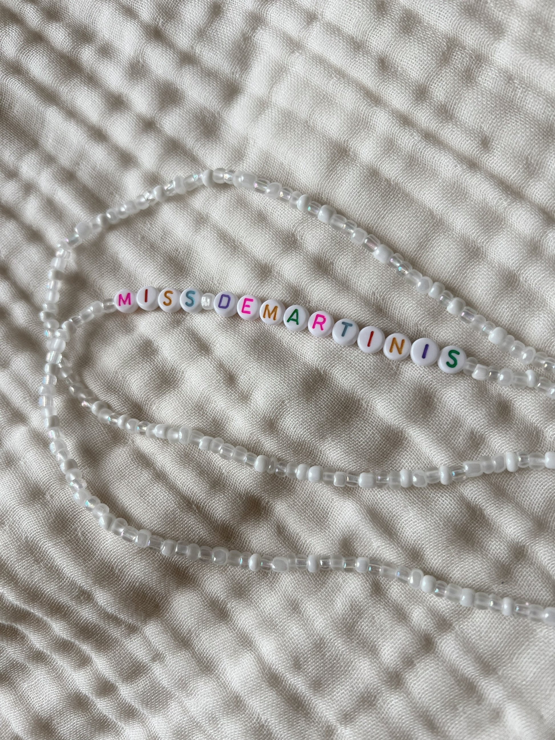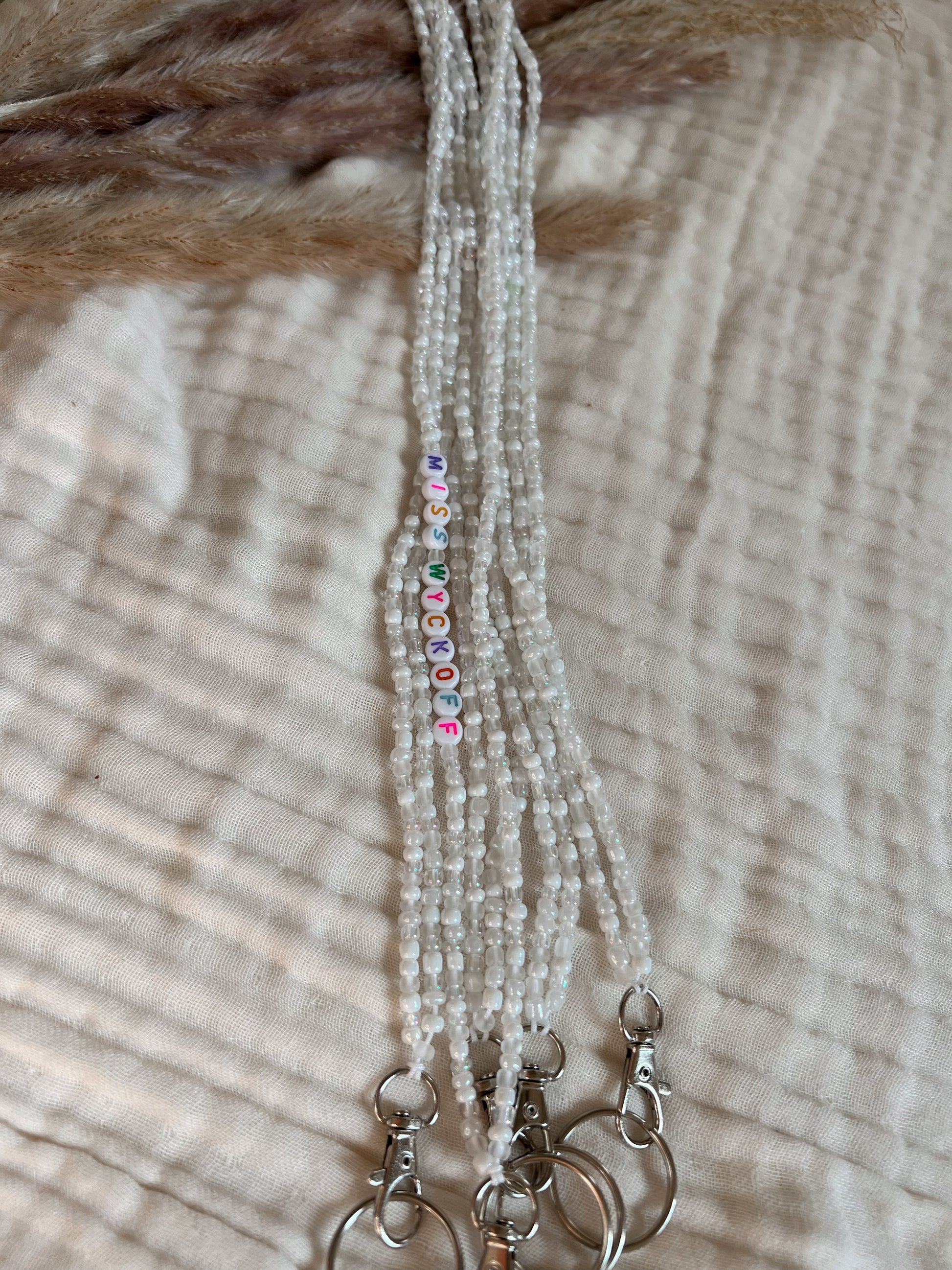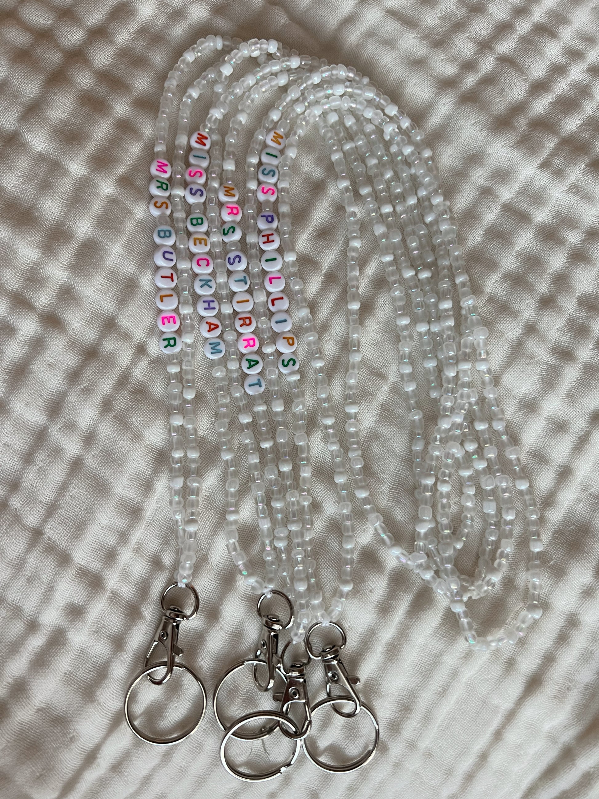 White Pearl & Glass Personalized Beaded Necklace Lanyard lanyard for work, school, teaching, students, or keys! Great for teachers to be in style while also holding all important badges and keys for daily activities. Perfect teacher gift for new teachers, teacher appreciation, and more. Great for any job needing to hold a badge or keys. Also great for interns and students. Easily matches any outfit.